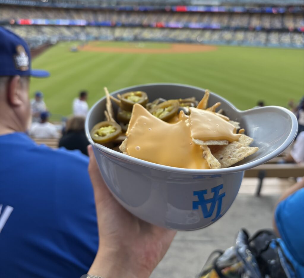 試合直前は混むと聞き、早めにドリンクや食事を買いに行きました。スタジアム価格ということもあり、ビール1缶、スーベニアカップ付きソフトドリンク1杯、ヘルメット入りナチョス、ホットドッグの4点で$65でした。恐るべき物価高ですね。